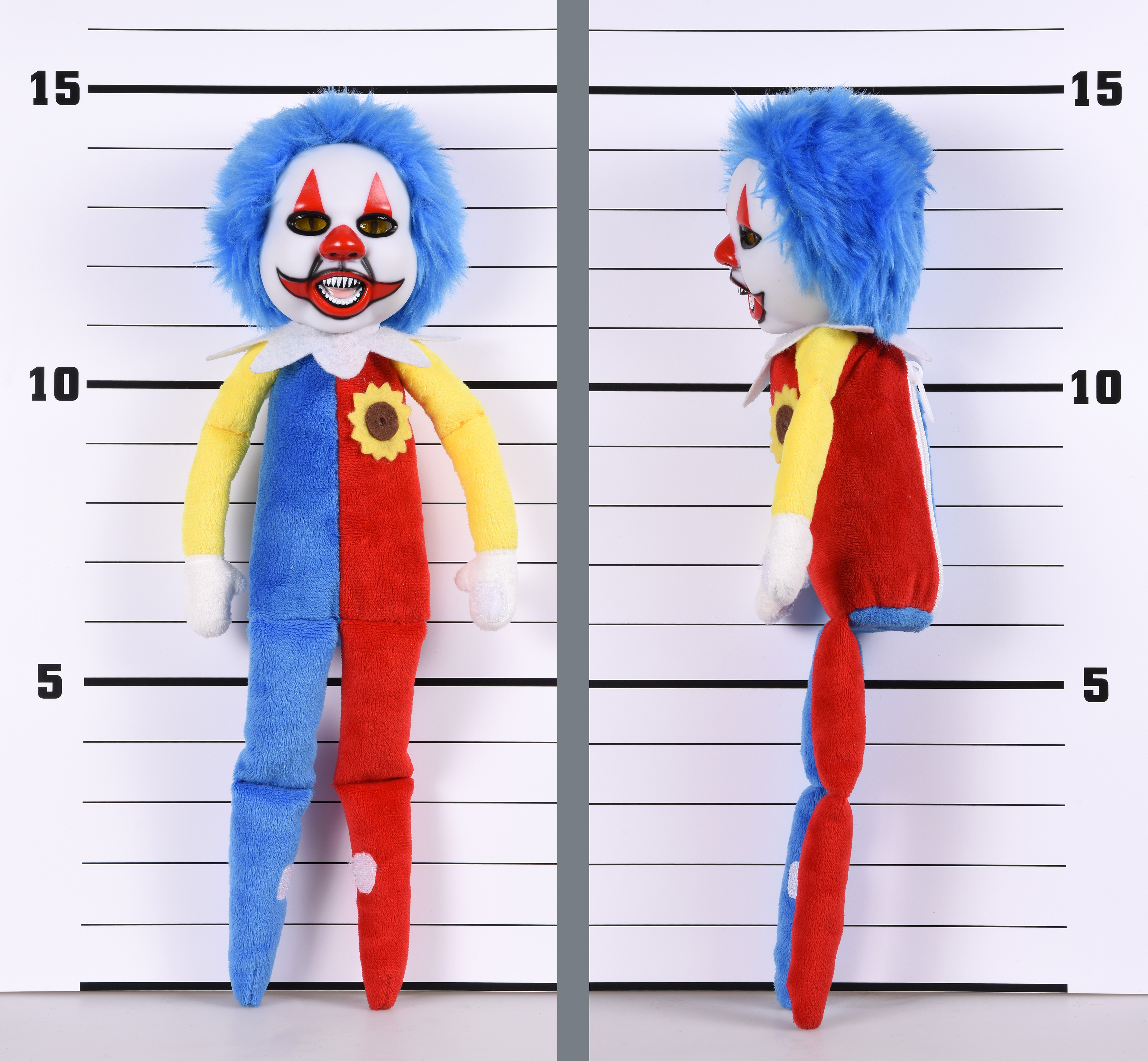 The doll itself is powered by two AAA batteries and features a molded plastic head with flashing LEDs behind its eyes. The seat area is flat and weighted for easy sitting poses, and hook and loop pads are attached to the hands and feet, creating a myriad of possibilities for hanging, posing and even attaching other objects to the Clown.
