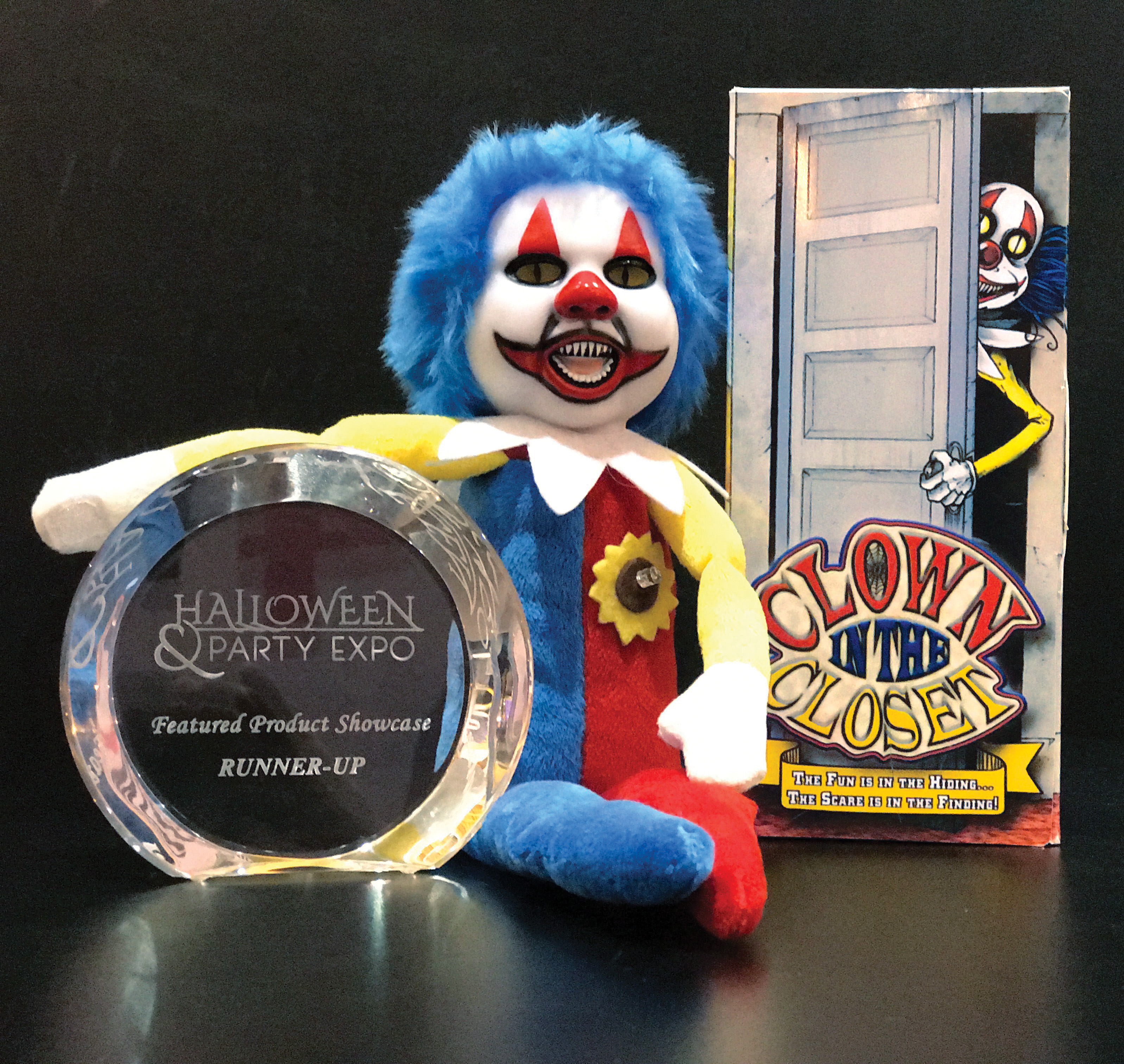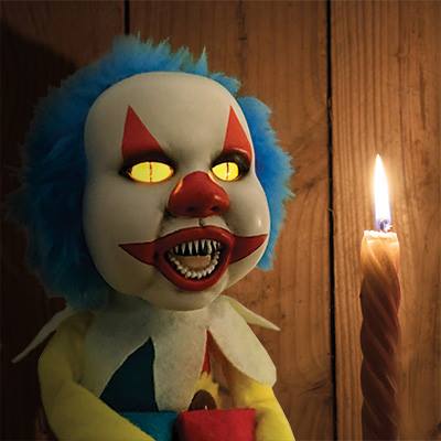 From the official press release: The Clown in the Closet is a 14-inch plush doll featuring flashing eyes and a sinister laugh triggered by a light-sensitive photocell. He is designed to be hidden anywhere it is dark – closet, cupboard, drawer, etc. – then startles the next person to find him with flashes of light and a scary laugh. That person then hides the Clown in a new location and the game continues.