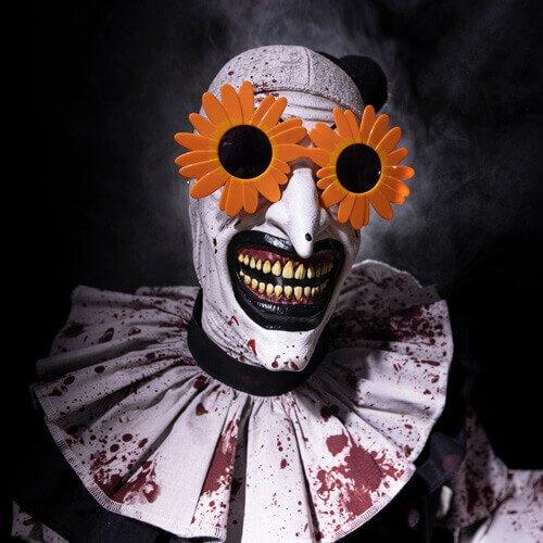 Standing 6.5 feet tall, the Art the Clown animatronic moves side to side at the waist, while his head turns and his arm with the hacksaw from Terrifier in his right hand moves up and down, holding his horn in the left hand. His sound effects include creepy music, his horn, and the hacksaw sawing, and you can choose to pose him with or without the included sunflower glasses from Terrifier 2.